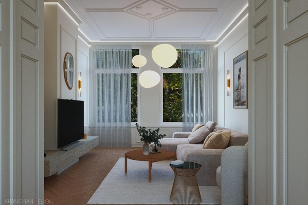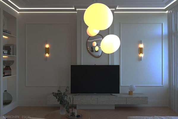 Het appartement straalt rust uit, dankzij overvloedig gebruik van lichte tinten en texturen die door de ruimte dansen. De combinatie van behouden plafonddetails en strategisch geplaatste verlichtingselementen verbetert de algehele esthetiek, waardoor het interieur zowel uitnodigend als magisch aanvoelt. #Interieurverlichting #Sierlijstverlichting #ElegantOntwerp"