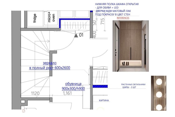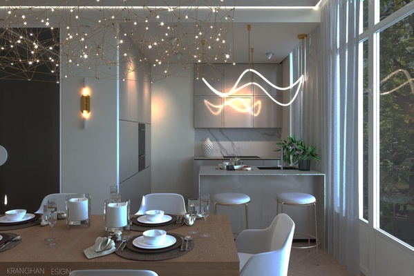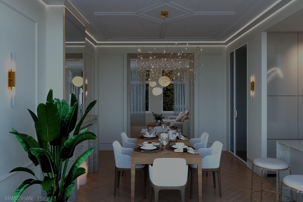 Verlichting. Ik heb het originele pleisterwerk op het plafond behouden en een tweelaagse sierlijstverlichting rondom de gehele omtrek geïntegreerd. Deze verlichting verlicht niet alleen de kamer, maar creëert ook een knusse sfeer en geeft het interieur een gevoel van lichtheid en betovering. Wandlampen benadrukken details en voegen een elegante touch toe. De kroonluchter boven de eettafel draagt bij aan een luchtige en etherische ambiance.