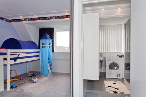 Placing of a dormer over the whole width of the house allowed the building of a second bathroom for children, a laundry space and a spacious kid's room.