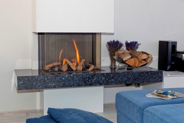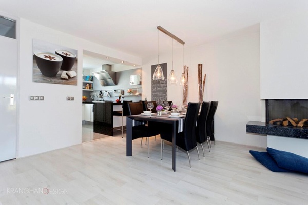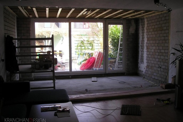 Living room.An extension on the ground floor has been built.Floor to ceiling sliding doors over the width of the ground floor bring the outside in. The triple glazed windows make the living room light and spacious while saving energy during cold winter months. A remote controlled gas fireplace replaced the old wooden one.