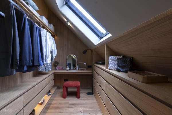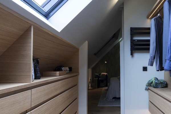 Пространство за лестницей, ранее неиспользуемое, я присоединила к спальне, чтобы создать просторную гардеробную. Для учёта изменений внутренней и внешней архитектуры дома, были привлечены архитектор и инженер. После всех технических просчётов и уведомления Муниципалитета города, мы приступили к реализации проекта.