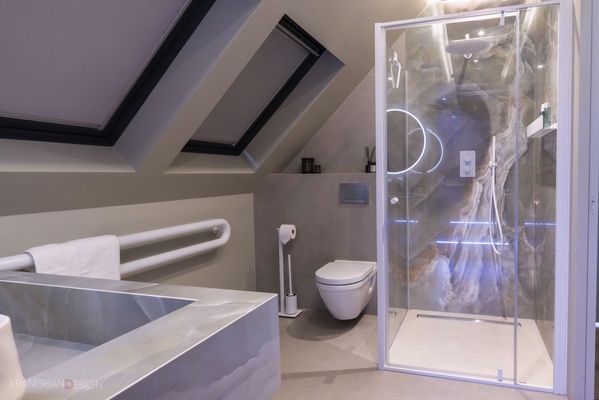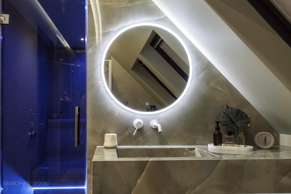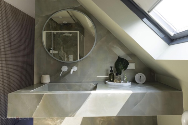 Для создания просторной мастерванной с входом в хамам, мы снесли стену между ванной и бывшей гардеробной. Ванная кажется ещё более просторной благодаря добавлению двух мансардных окон. Визуальное увеличение пространства достигнуто использованием крупноформатного керамогранита размером 150 × 150 см. По моим чертежам была изготовлена раковина из того же материала. Этот керамогранит стал вдохновением для всего проекта. Чтобы рисунок плитки выглядел цельным, я лично контролировала процесс её укладки, что позволило добиться идеального сочетания текстур.