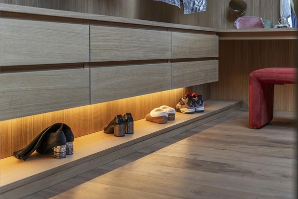 Гардеробная и рум-дивайдер покрыты шпоном дуба. Все размеры и конструкция обсуждались с поставщиком, чтобы найти баланс между качеством и стоимостью. После выбора цвета были сделаны тестовые выкрасы шпона, и только после этого началось производство.
