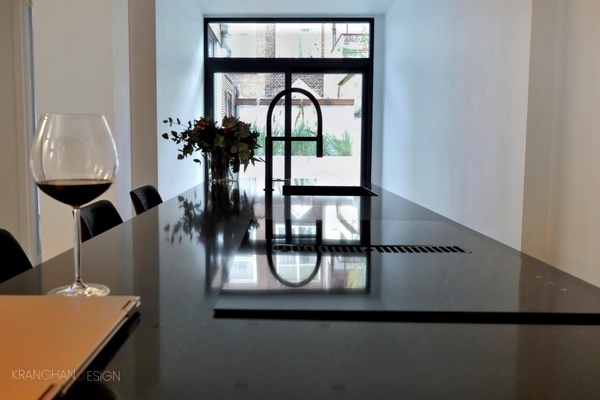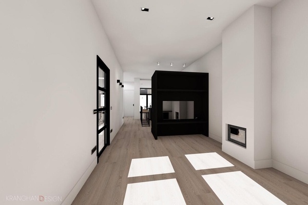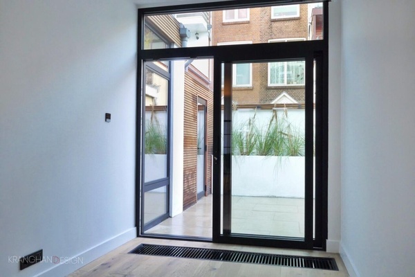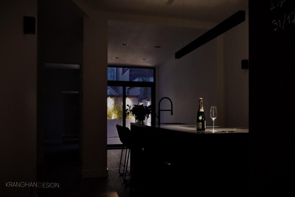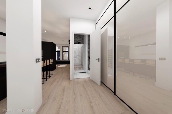 - Kozijnen van vloer tot plafond. Profielen van geborsteld aluminium komen terug in op maat gemaakte schuifdeuren in de hal, de woonkamer en in de de armatuur van de wand verlichting.