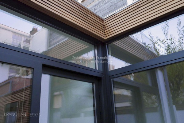- Ayous hout zorgt niet alleen voor de uitstekende isolatie, maar creëert een mooi lijnenspel en contrast met zwarte aluminium kozijnen van geborstelde staal.