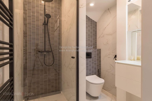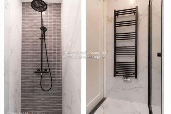 - Badkamer ca 4 m2 met inloop regendouche en marmer look tegels van liefst 75x75 cm