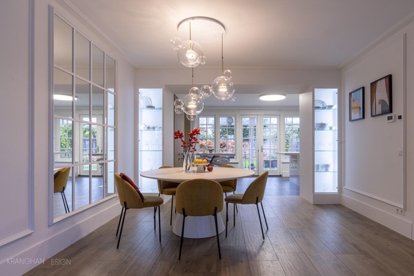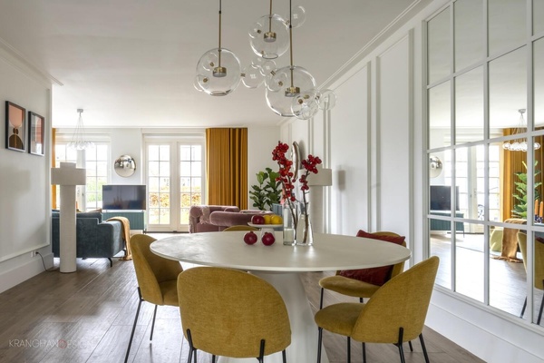 Зеркало, созданное по моим эскизам, стало ключевым акцентом в столовой зоне. Оно подчёркивает форму окон и наполняет пространство дневным светом. - Мебель и зонирование: