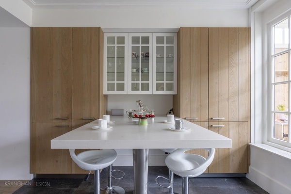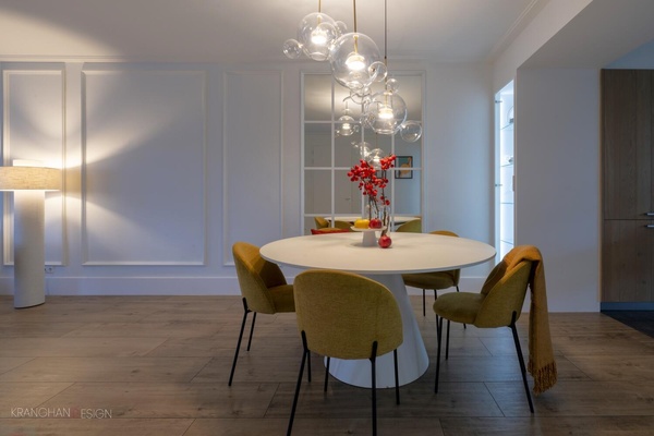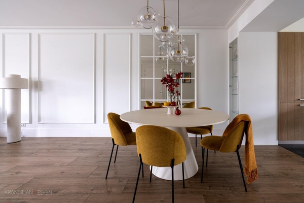 На кухне добавили навесные шкафчики из IKEA и эффектный круглый светильник, чтобы сделать пространство более практичным и уютным. - Классические элементы: