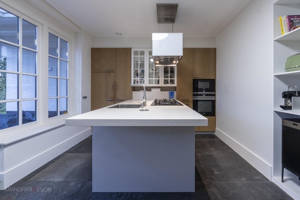 Мы демонтировали старую нишу и выстроили симметричную конструкцию шкафов, которая теперь отделяет гостиную от кухни.- Со стороны гостиной: шкафы со встроенной подсветкой и стеклянными дверцами. Теперь здесь хранится семейный сервиз, который раньше пылился в гараже.