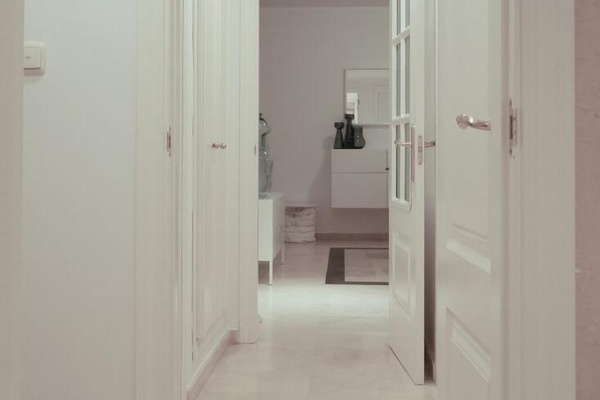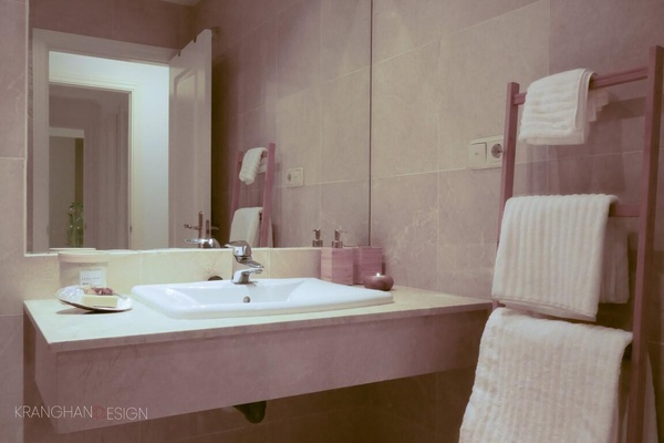 Мастер-спальня и прилегающий к ней санузел «en-suite» также отгорожены небольшим коридором и дверью от гостевой спальни и санузла. Создаётся ощущение номера в номере, что создаёт дополнительную приватность. В обоих санузлах расположено всё самое необходимое: ванная, раковина, биде, туалет. Санузлы выполнены в нейтральных бежевых тонах.
